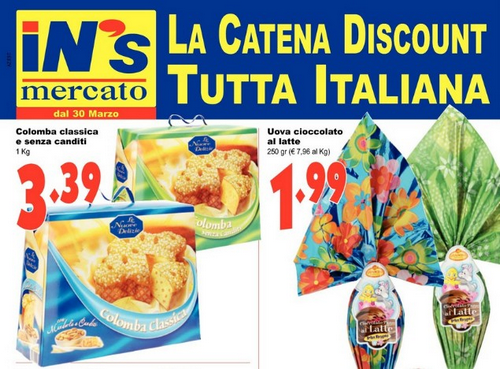 Volantino iN’S Roma offerte aprile. Per il nuovo mese che inizierà domani, il discount del gruppo Pam propone prezzi vantaggiosi per molti prodotti alimentari. Sugli scaffali di questi supermercati si possono già trovare (la promozione è cominciata ieri) la Colomba classica e senza canditi a soli 3,39 euro. Rimanendo nell’atmosfera pasquale si possono acquistare le uova di cioccolato al latte che costano 1,99.